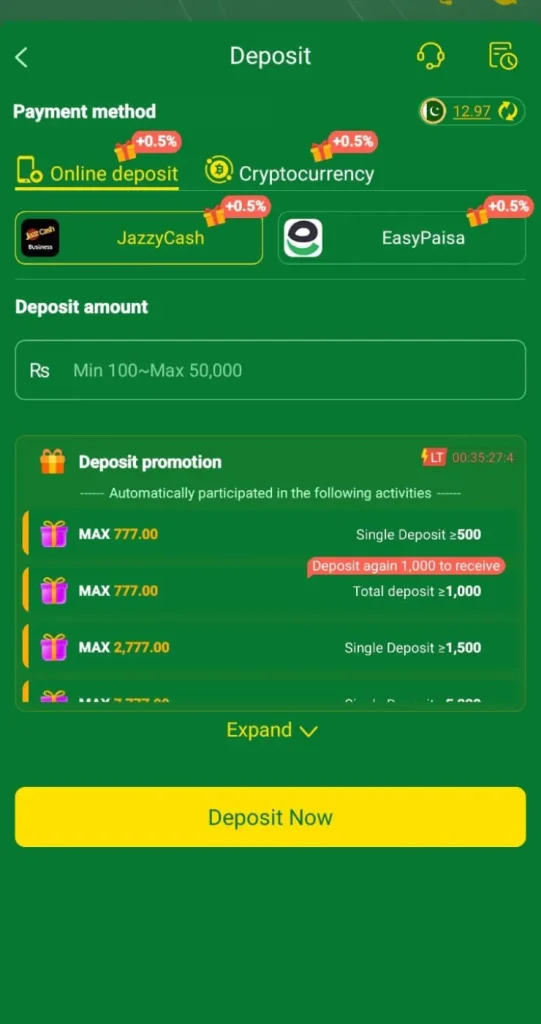 - Choose “Deposit” and select payment method.