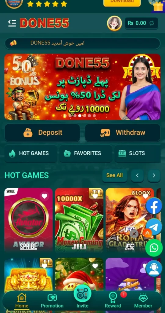 Done55 Game offers many different games for all types of players. You can enjoy digital card games, online slot machines, Teen Patti modes, Rummy, sports betting, and live casino games. Because there are many options, players do not feel bored and can always try something new.